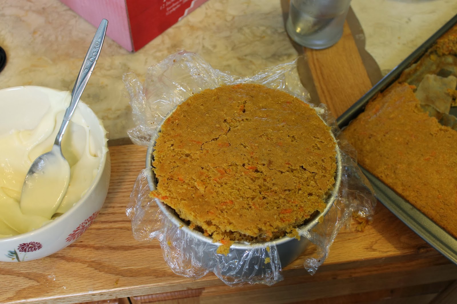 In the cook book the cakes are stacked in pans that have a piece of acetate acting as a liner. The acetate is pliable enough to be wrapped around the inside of the cake pan but stiff enough to allow the cake to hold the nice level shape you can build. I didn't use an acetate liner simply becuase I don't have one, but I do have a 3" high cake pan which worked great. Wrap the cake pan completely with plastic wrap leaving a few inches hanging over the edge.